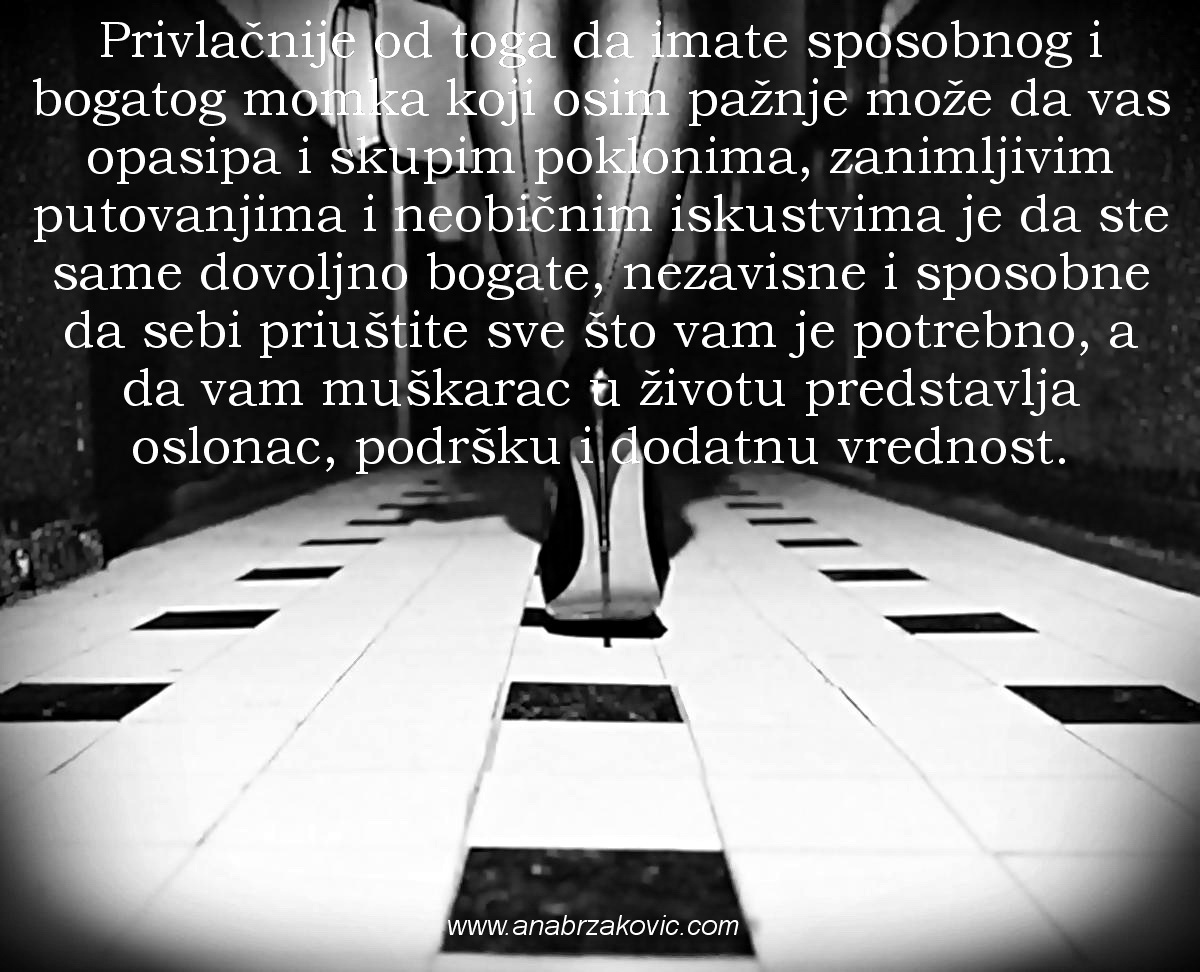 Privlačnije od toga da imate sposobnog i bogatog momka koji vas osim pažnje obasipa i skupim poklonima, zanimljivim putovanjima i neobičnim iskustvima je da ste same dovoljno bogate, nezavisne i sposobne da sebi priuštite sve što vam je potrebno, a da vam muškarac u životu predstavlja oslonac, podršku i dodatnu vrednost.